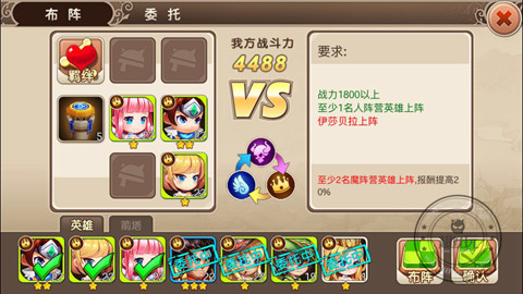 接受贸易的时候要进行适当的英雄布阵,在满足委托基本要求的基础上也要注意额外要求,如上图,当有至少2名魔阵营英雄上阵时,报酬会提高20%;