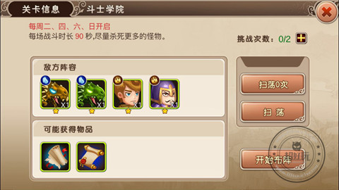 斗士学院每周二、四、六开启,每场战斗限时为90秒,尽量击杀更多的怪物可以获得更多的奖励,主要的奖励为各种经验卷轴!每天可以进行两次挑战,花费钻石可以购买更多挑战次数!