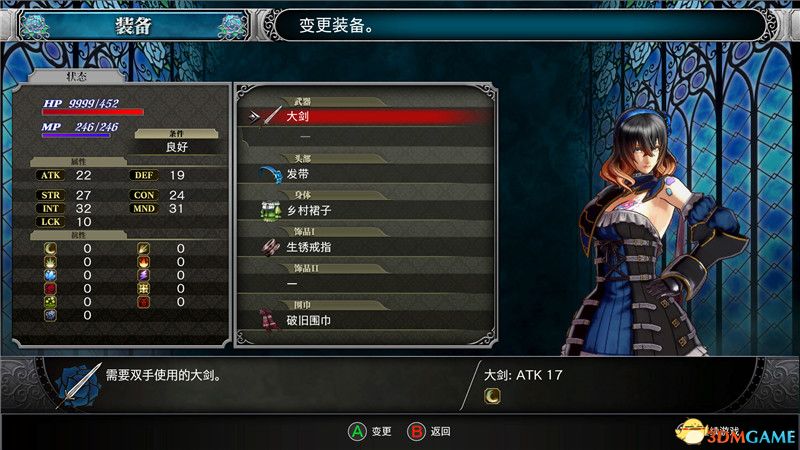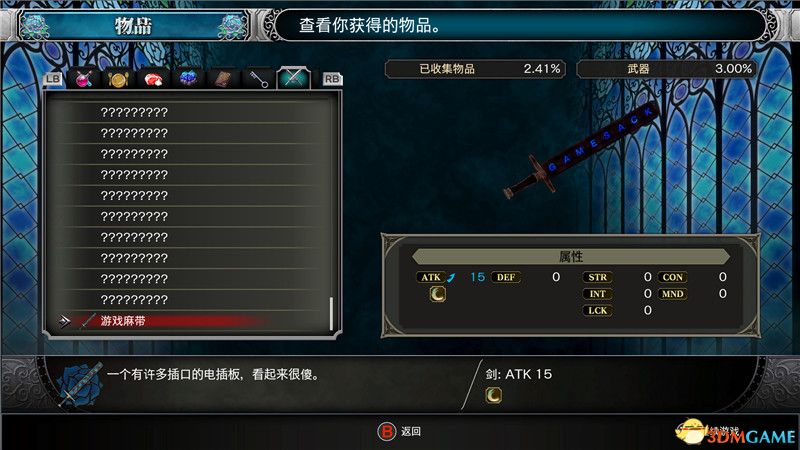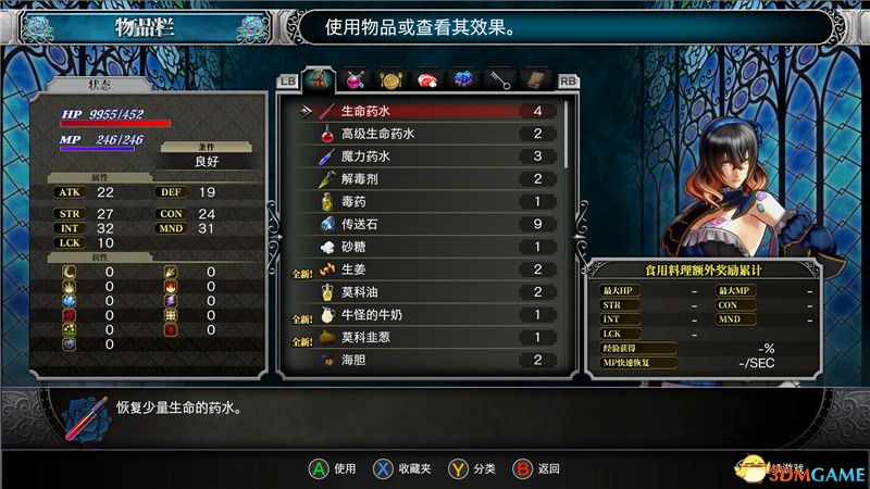 物品栏:物品栏中可以显示角色目前拥有的物品,包括武器,装备,消耗品,材料,任务物品等。