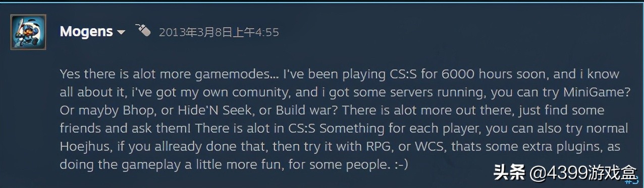 于是叔进入了讨论区开始检索Hide and seek,最终发现这位叫Mogens的用户在2013年表示已他已经游玩《CS:起源》长达6000小时,作为老用户他想询问一下制作组是否有考虑将Hide and seek加入到地图之中。