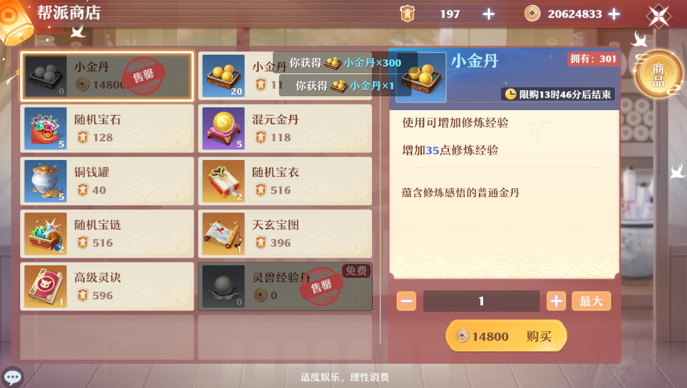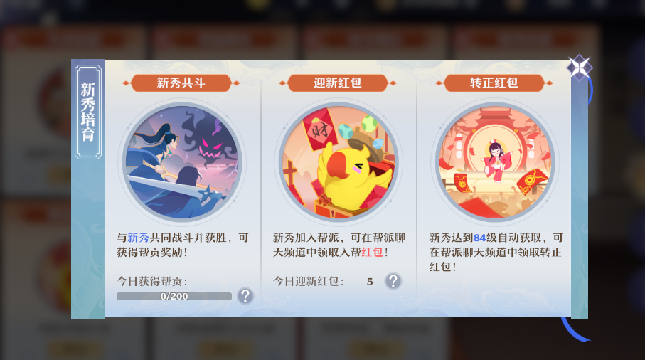 其次是加帮派,《梦幻新诛仙》中帮派能够提供的帮助相当大,推荐各位最好是第一天就加个帮派。游戏中帮派有一套十分完善的帮新机制,比如通过帮派中的“新秀共斗”玩法,我们可以找帮众大佬带我们打本。此外帮派商店中的免费小金丹和铜币小金丹最好都别放过,这对于前期的提升相当大。