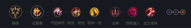 卡萨丁符文选择征服者,虽然征服者被削弱,但依旧还是比较适合持续作战的卡萨丁,半肉搭配征服者收益比较高。下面三行符文固定搭配,第一行选择气定神闲,第二行选择韧性,第三行选择致命一击,其他符文收益都太低。副系选择主宰,血之滋味线上回复,终级猎人可以减少大招冷却,虽然后期卡萨丁大招CD比较短,但是能够更短一点操作上限会更高。