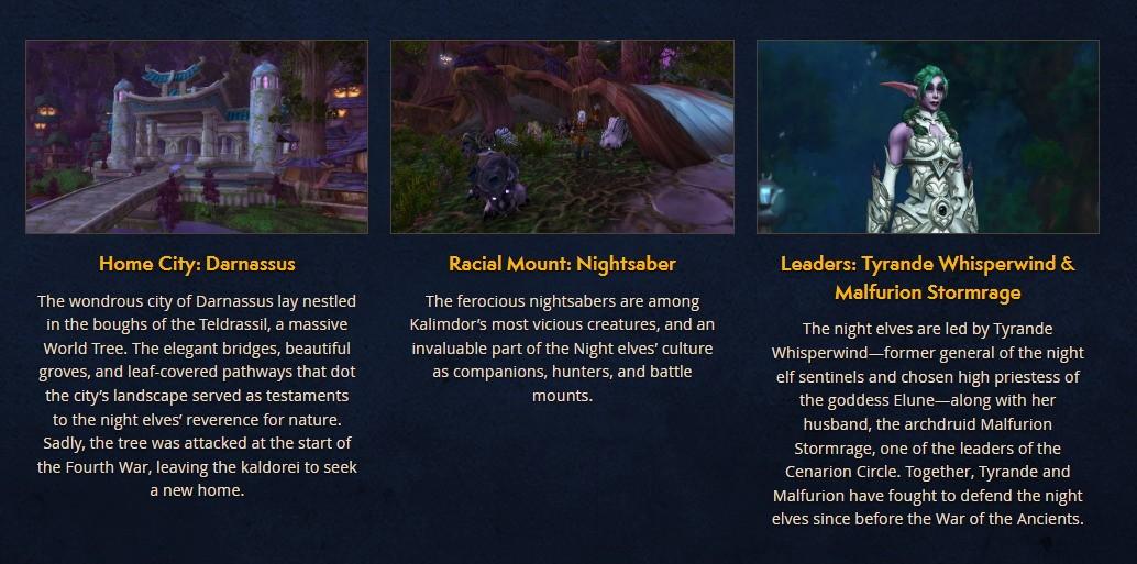 《魔兽世界》新版种族设定遵循自《军团再临》和《争霸艾泽拉斯》以来的传统,介绍页面包括种族传统、家乡、装备、领袖和坐骑等等。
