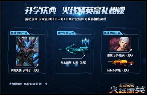 开学在即,狂欢盛宴从沙利尔开始!本周9月1日~9月4日只要登录即可获得杀戮天使-沙利尔(1天)的系统奖励。连续登录2天可再得双发短弩-幻影(1天)~连续3天登陆还可以获得恶魔之手-迪奥和M249-辉煌喔!小伙伴们快约上战队好友一起来火线精英吧~~