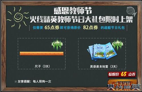 新学期,新装备!3天教师直尺外加英语课本地雷只需65点券即可入手,节日限定武器仅在节日期间贩售,节日过后就将全面下架游戏商城。好机会不要错过哟~