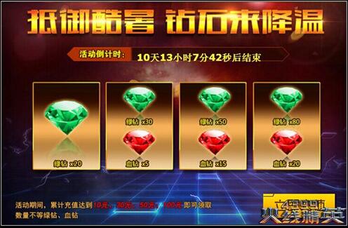 本周活动期间内,累计充值金额达到10元、30元、50元、100元即可获得大量绿钻、血钻回馈。钻石奖励可以叠加!即累计充值达到50元,即可累计额外获得绿钻100颗,血钻20颗!