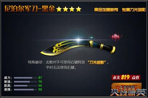 全新黑金系列近战武器,神秘又充满异域风情的黑-金双色塗装,趁手的好手感,还有黑金系列特有的特殊技能,只要819点券即可获得永久啦!尼泊尔军刀-黑金的特殊技能“刀光剑影”效果拔群,全模式可用!本次更新中全新上架的刀战模式也很适合喔~