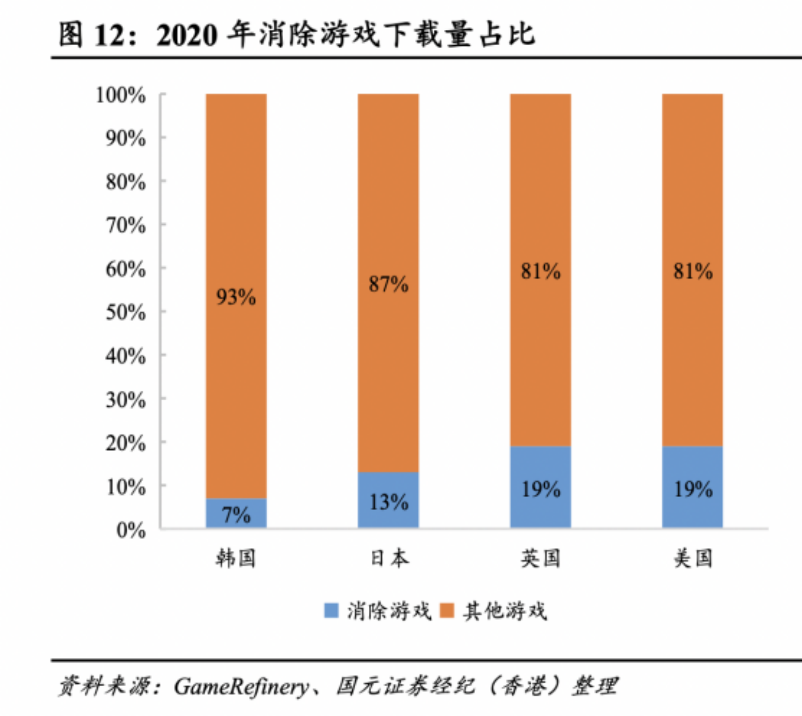 据GameRefinery报告,2020年消除类游戏是美国和英国最大的细分游戏品类,均占所有游戏的19%,约占整体市场收入的27%和24%。