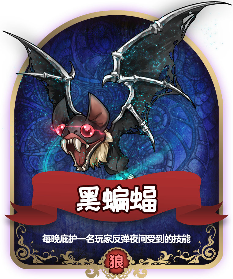 黑蝙蝠:属于狼人阵营,可以选择一名玩家进行庇护,被庇护的玩家免受夜间技能(女巫的毒,守卫的守护)。若被庇护的玩家遭受技能,则技能反弹,释放技能玩家死亡。