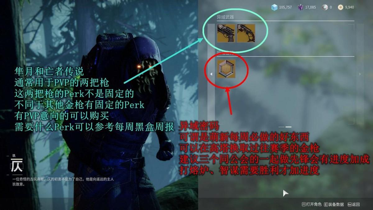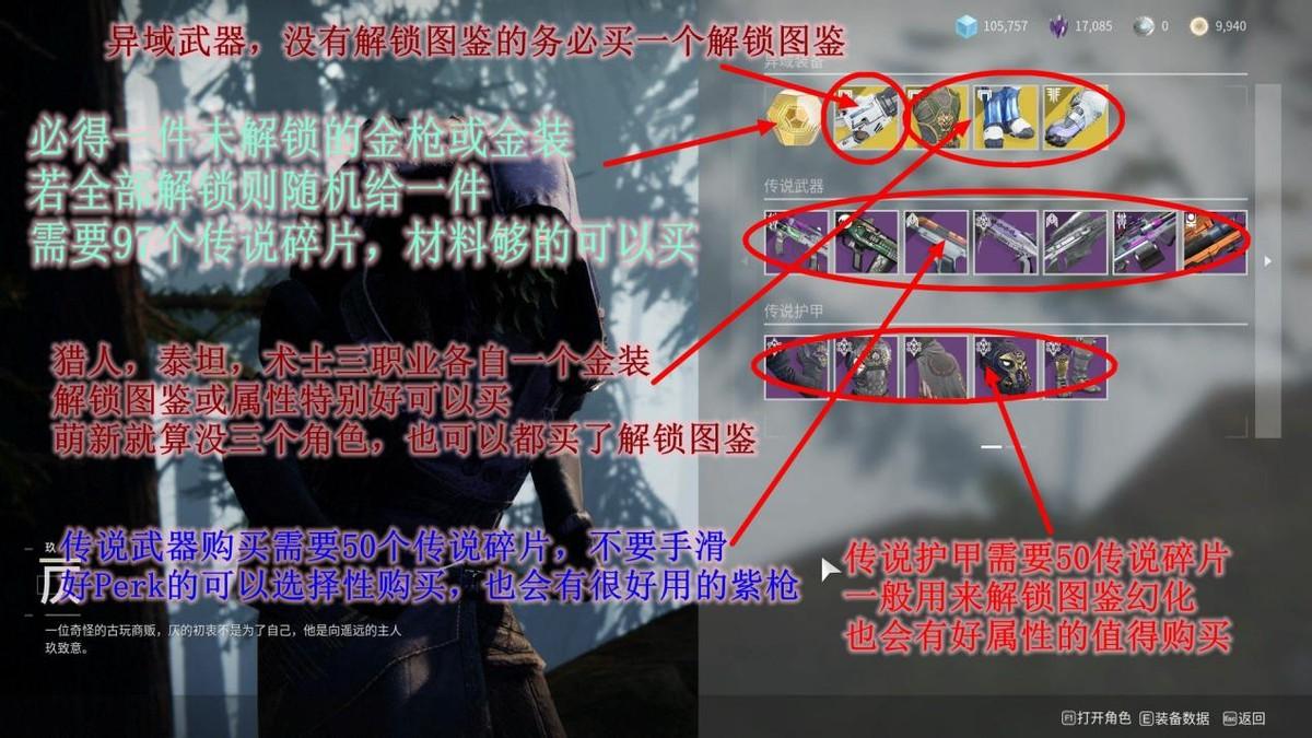 金枪一定是必换的,三角色金装也十分推荐买了开图鉴放保险库。紫枪的Perk和护甲(三个职业不一样)的属性值不值得买可以每周在黑盒中查到,自己觉得好看的护甲可以买一个解锁图鉴用于以后的幻化。