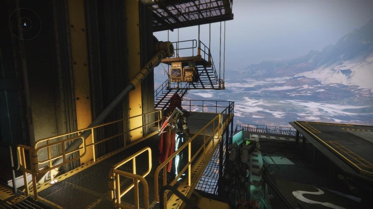 高塔中庭落地后左转一直走进机库,机库左转尽头有楼梯,老九在楼梯上。