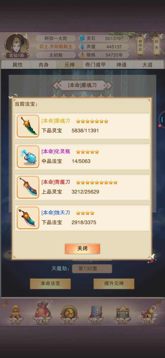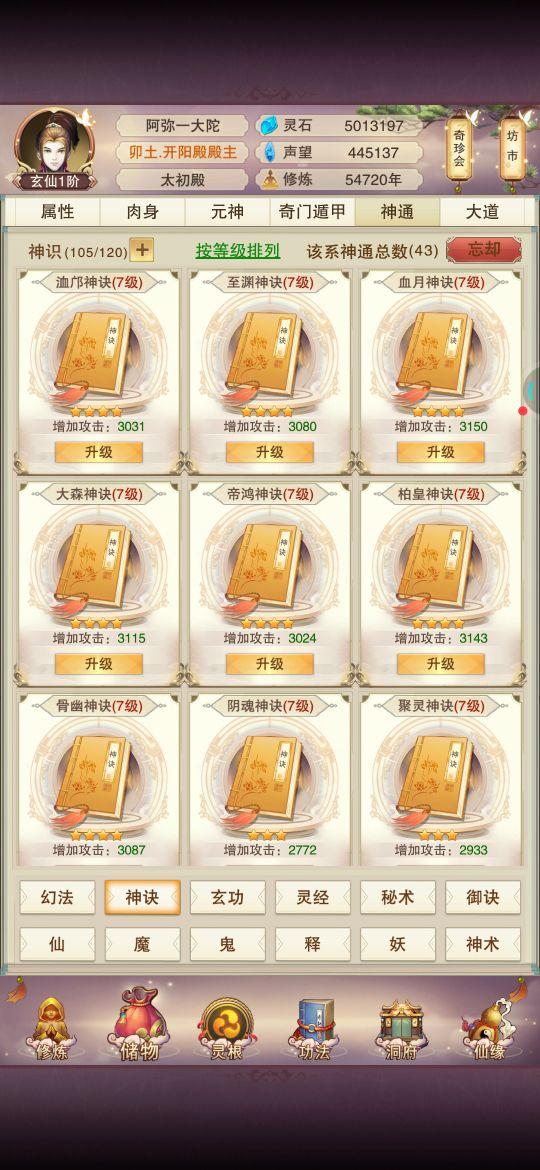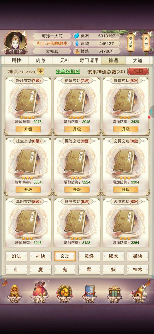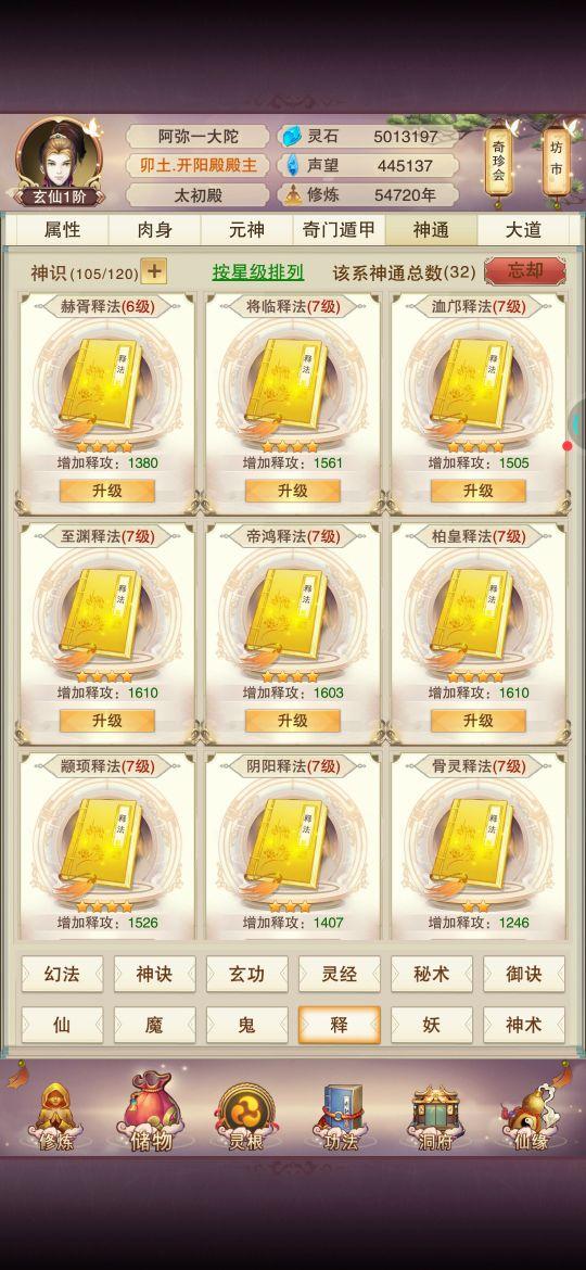 神通就学了攻防和释功,实在是升级神通点太费神识碎片了,120个技能点把释功都学全了,每个天外天4本,攻防都是顺带学的,没有学全,基本都升到七级了