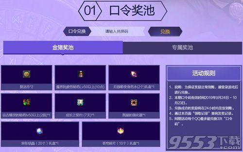 9月合作专属福利中心的口令有限期是9月24日至10月23日,活动期间可以使用该口令领取到魔界抗疲劳秘药、厄伽勒变身药水、远古精灵的秘药、便捷式锻造器、成长胶囊、精炼的时空石、异形结晶和苍穹碎片中的一个,该奖励是随机领取的。