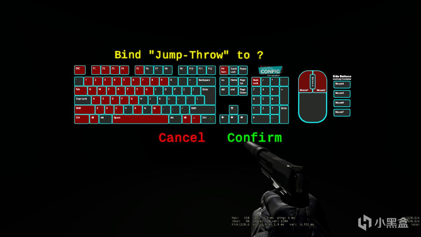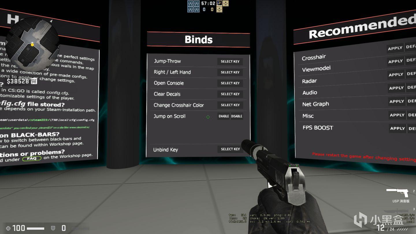 bings栏下是一些需要绑定的指令, 从上到下分别是,跳投,切换左右手,打开控制台,清除弹孔血迹,更改准心颜色,滚轮跳。