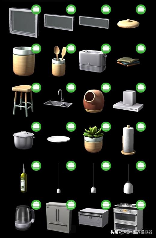 美味厨房包:厨房相关的自定义道具组,包含互动功能和多种配色及纹理,部分模型来自原版游戏。