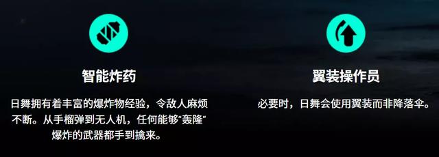 主要能力:因为日舞有着极其丰富的爆炸物经验,所以她会部署智能炸药,从手榴弹到无人机,任何能够爆炸的武器都特别拿手。另一个技能名叫翼装操作员,在必要时,日舞可以使用翼装而不是降落伞。