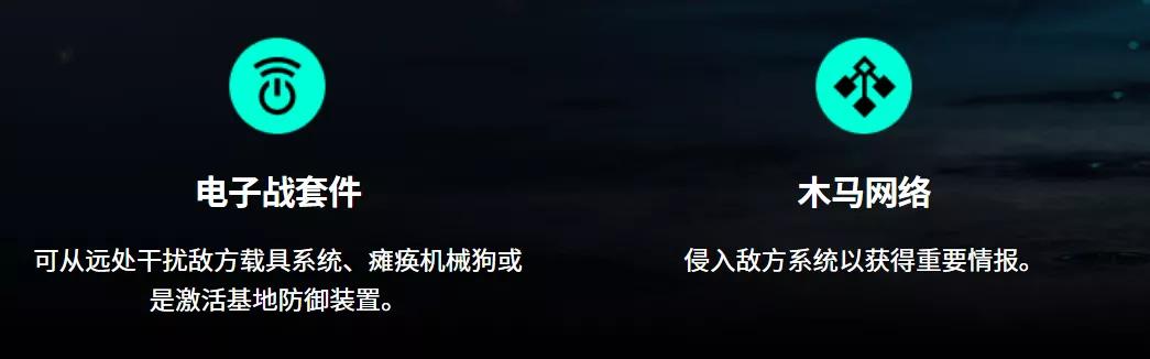 主要能力:部署一个电子战套件,可以从远处干扰敌方载具系统、瘫痪机械狗或是激活基地防御装置,另外一个木马网络技能则可以侵入敌方系统获得重要情报。