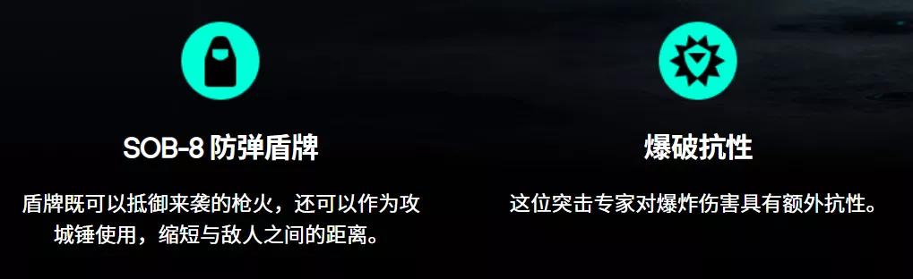 主要能力:部署一个SOB-8防弹盾牌,盾牌既可以抵挡来袭的枪火,还能作为攻城锤使用,以达到缩短与敌人之间的距离的目的。另一个技能名叫爆破抗性,可以使这名专家对爆炸伤害具有额外抗性。