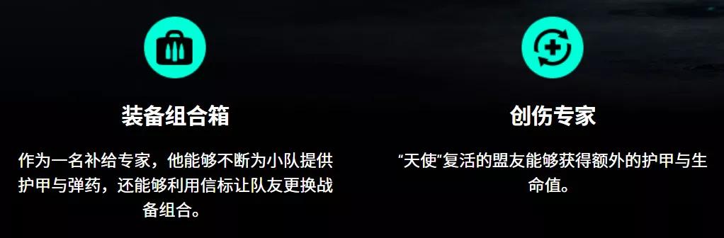 主要能力:可以部署装备组合箱,能够源源不断的为小队提供护甲与弹药,同时还能利用信标让队友更换战备组合。另一个技能创伤专家,可以复活盟友,同时复活的盟友能够获得额外的护甲与生命值。