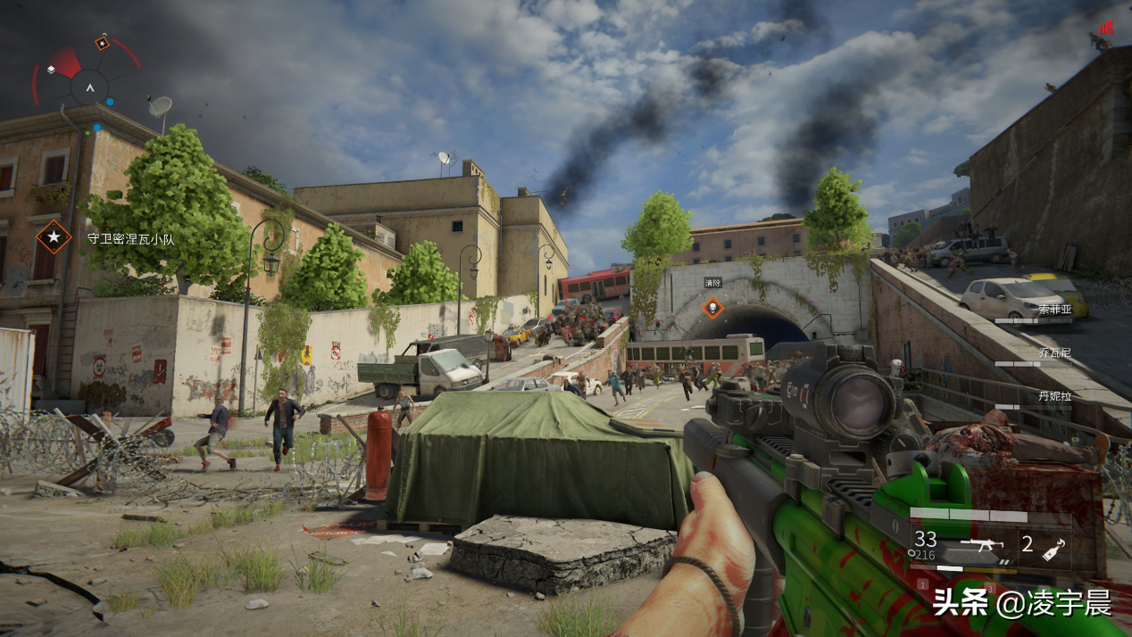 第一人称,自然是FPS的重头戏,更能够增加游戏的沉浸感,但《僵尸世界大战》的第一人称体验实在是有些糟糕。最大的缺点在于人称的不连贯,在攀爬、搜寻、安装物品甚至是近战攻击时,视角都会换到第三人称,尤其是在拿电锯的时候,我在那里期待着疯狂的杀戮盛宴,结果给整了个第三人称,属实令人败兴。另外游戏中的开镜,真的只是简单的放大,而不是换成瞄具,实在是有很多赶工的嫌疑。枪械的打击感也不够强,但后坐力、回馈、精度等方面都堪称顶级,只是不支持手柄输入也是一大遗憾。