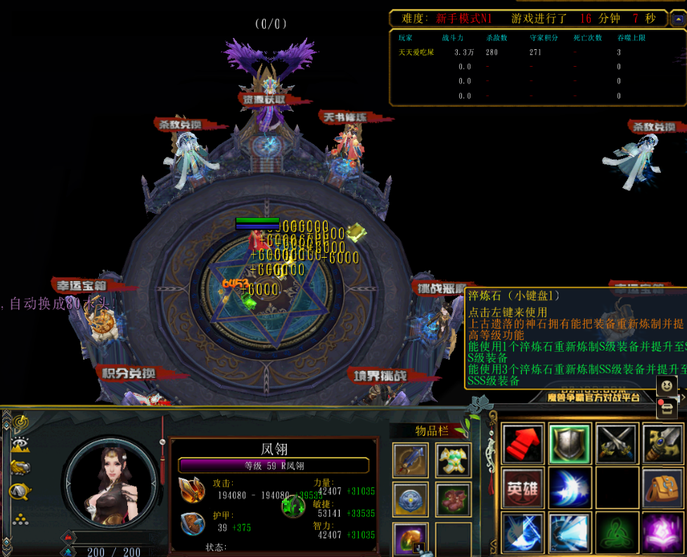在这个过程中,我们可以回到练功房,开始挑战恶魔。恶魔给淬炼石,重铸石和吞噬上限,且可反复挑战。后两者大家都很熟悉了,而淬炼石可是个好东西!当装备合成至S级时,再通过3合1就有不低的概率失败!那时候系统就会吞掉2件装备,相当亏!但是用淬炼石就可以100%进行强化,甚至将S级装备直接炼到3s级进行吞噬入体。