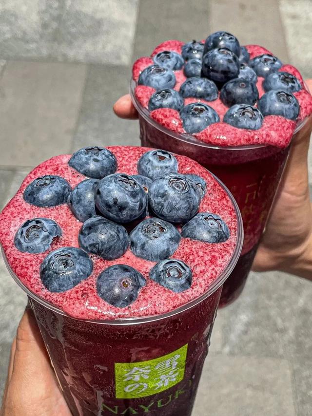蓝莓党看这里!大颗实在的佳沃蓝莓平铺顶部,杯内手捣蓝莓果肉爆浆看得见,一杯都是料,试问谁顶得住?