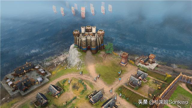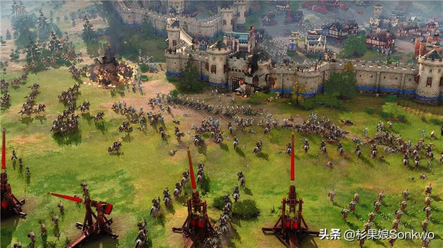 更有趣的是,《帝国时代4》对城墙进行了大刀阔斧的重做:现在防守方可以将单位安排在城墙上向下射击,进攻方则能建造攻城塔来让近战单位登上城墙。虽说水雷社不设计梯子有点奇怪,但本作的城墙确比二代那个单纯堵路的墙要有趣太多了。