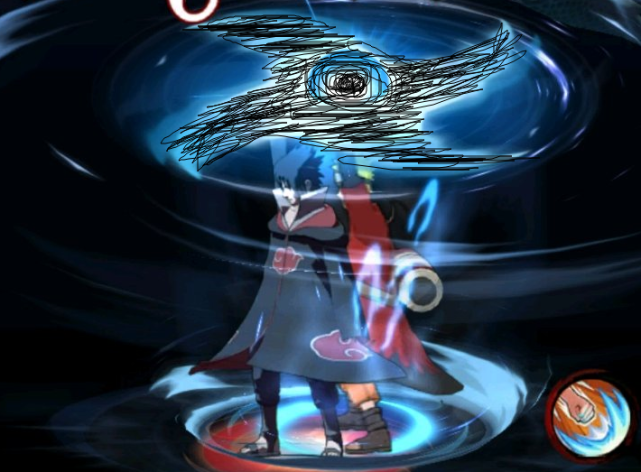 在对战六道带土的时候佐助曾和鸣人联手使用过一招灼遁·光轮疾风漆黑矢零式,也就是天照螺旋手里剑。于是有一位玩家突发奇想,用鹰佐和仙鸣还原了这个技能!动作看上去还是非常帅气的,只可惜没办法把天照加进去,只能用涂鸦来凑合凑合了,哈哈!