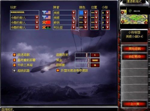 12。钱快用完时,把鼠标放总部上,另只手按下L,鼠标就快速点击,钱在狂涨,260000呀!适于遭遇战,联机没试过,估计也以!!!!!!!!!!!!!!!!!