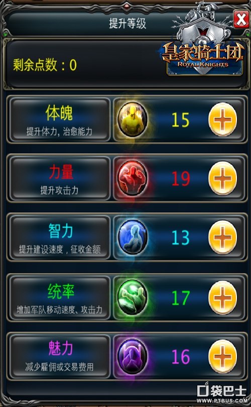 《皇家骑士团》除了丰富的故事剧情,和模式多元化的副本外,还拥有RPG游戏最具特色,最不可缺少的角色养成系统。在游戏中,你的每一次升级都将获得一次加点的机会,为你的角色增强体魄、力量、智力、统率、魅力,这五种基本属性,每种属性都会产生不同的效果,就看你如何抉择。除此之外,你还可以通过商店购买强力装备和雇佣佣兵。这些都会从不同程度上增强你的英雄实力。