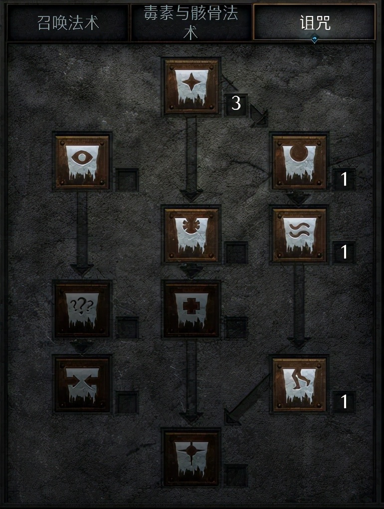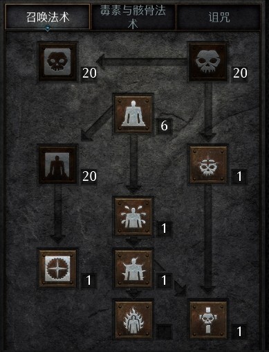 召唤流死灵法师是以复生骷髅和尸爆为输出核心,以黏土魔像肉盾或者钢铁魔像提供光环,配合着各种诅咒技能来构建。所以召唤死灵就是围绕着这些来加技能点。前期就需要把复生骷髅、骷髅专精、魔像专精加满。复生骷髅法师、尸爆、伤害加深、黏土魔像、衰老加1点,重生、骸骨护甲、骨矛可以选择加1点。死灵法师的加点会充裕,后期都加满后可以选择加伤害加深、尸爆,这两个技能的等级提高并不会增加伤害,但会提高技能的半径,增加技能的范围。