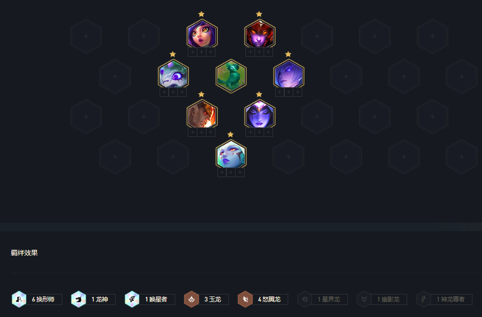 这个阵容在没有换形师转职和之心的时候9人口大成,最终羁绊由6换形师和3玉龙以及3怒翼龙组成。其中6换形师可以让整个整容都变得非常肉,再搭配玉龙的百分比回血效果十分不错,同时玉龙还可以提供攻速。所以站位方面就是让换形师们围着玉龙雕像站即可,奶妈没来之前可以用任意玉龙代替。