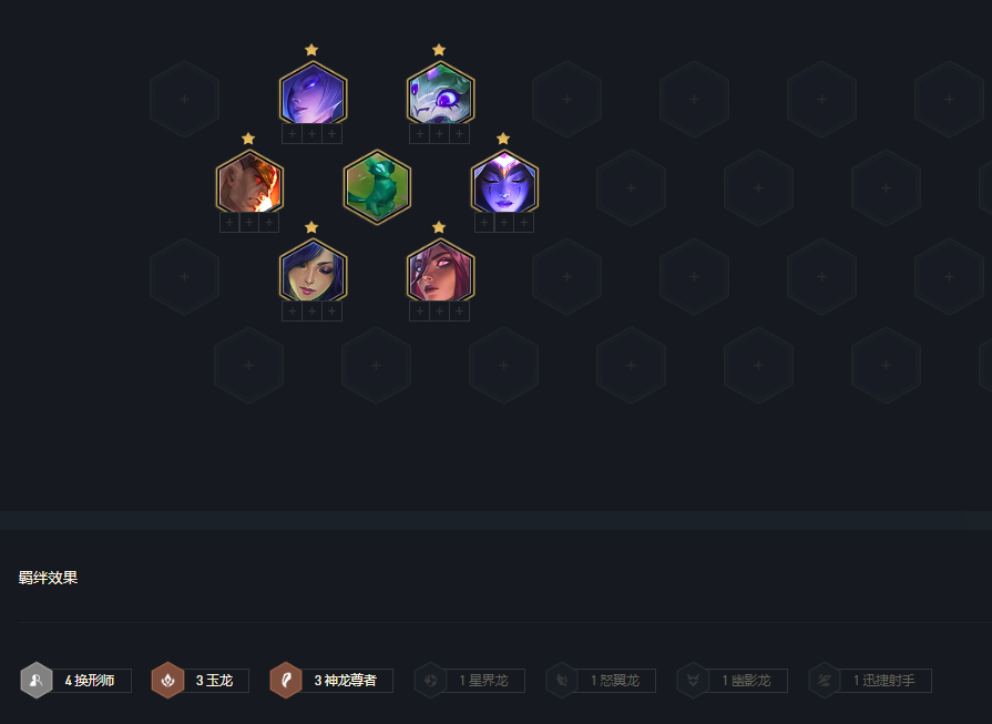 这个阵容最好的方式就是开局抢攻速,拿到3星界龙后吃连败,到打完石头人,这样可以有50块钱,同时还可以拿到想要的装备,打完石头人直接利用星界龙把3星豹女D出来。前中期阵容凑出4换形师,3玉龙和3神龙尊者,这套阵容可以一直连胜到8人口。