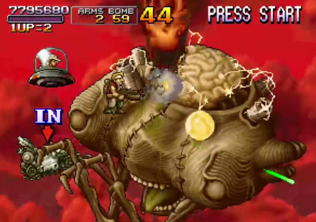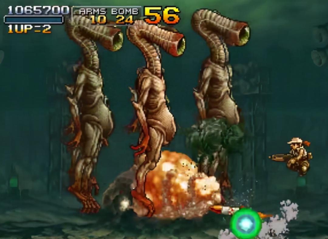 就是这么一个年代,一间名为Nazca的公司出现了,并在1996年为街机厅玩家们带来了《合金弹头》1代。就凭着到今天都有人在上传相关视频,你就知道这玩意在当时有多离谱。丝滑的流畅制作、幽默的欧美动画画风、花里胡哨的boss战,让这个IP在90年代如同惊雷一般砸向众人。在《合金弹头》出现之前,人物横版射击就是行业里的弟弟,而上一个火爆的还是80年代的魂斗罗。正所谓锁定难度8,老板笑哈哈,《合金弹头》出现仅过了一年,SNK就将Nazca收入囊中,把《合金弹头》这个IP牢牢地握在了手里,并连续推出相关续作。