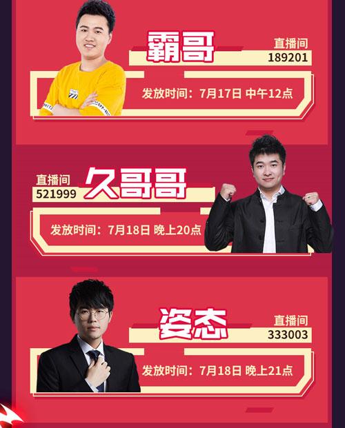 首先第一个渠道,就是在虎牙主播莎莉,小超梦,霸哥,久哥哥和姿态直播间里面,将会随机发放激活码。莎莉作为常年登顶国服第一的宝座,相信很多玩家还是非常熟悉的吧?毕竟路人王这个称号,不是说说而已啊。小超梦和霸哥就更加不用多说了,一个是实力上单主播,一个则是“混子上单”;久哥哥的话,他的妖姬也是令人十分深刻;最后则是姿态,作为前职业选手,他的知名度就不用多说了吧?