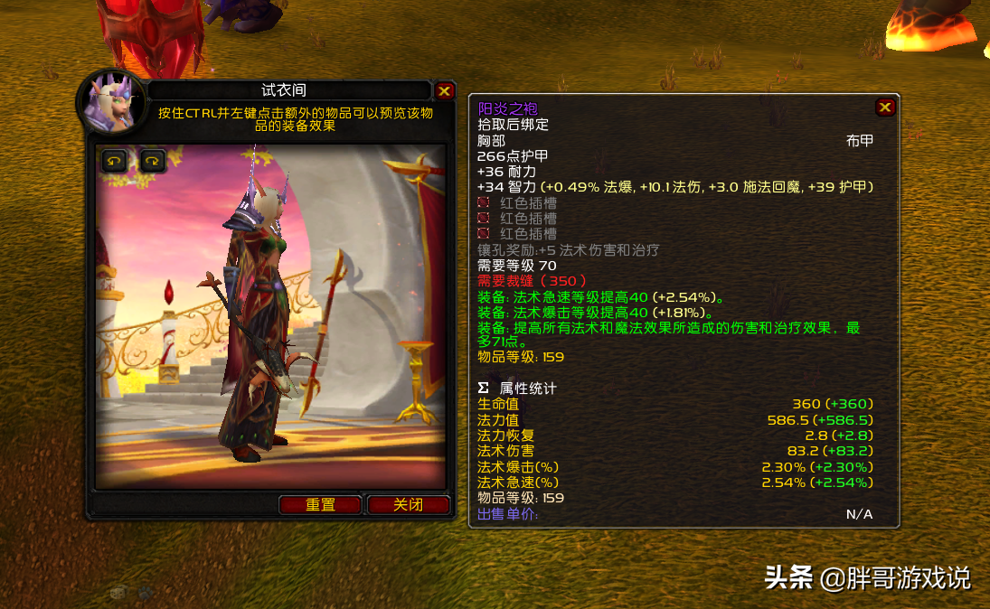 阳炎之袍的装等为159级,主属性为36点耐力和34点智力,绿字属性为40点法爆,40点急速以及71点法伤。