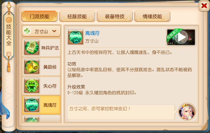 方寸的离魂符在PK中,一直是非常强势的技能之一。持续2回合的混乱状态,并且混乱状态不能被药品解除。
