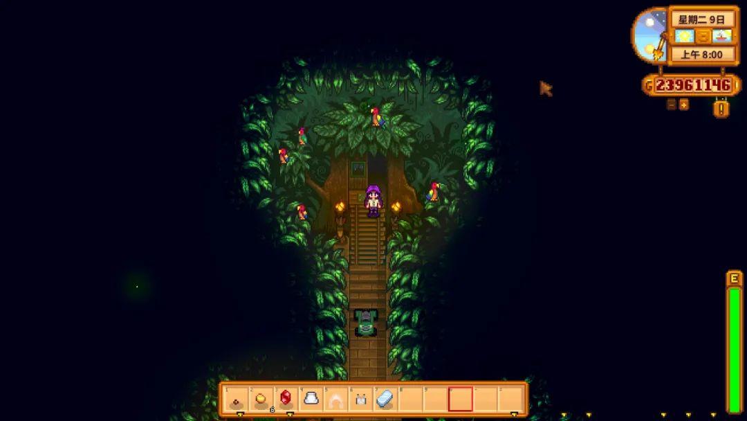 在对玩家的好感达到6❤之后,雷欧就会在玩家、莱纳斯等人的邀请下来到星露谷居住,鹦鹉在当天晚上就给雷欧制造了一个新的树屋出来,就在莱纳斯帐篷的旁边