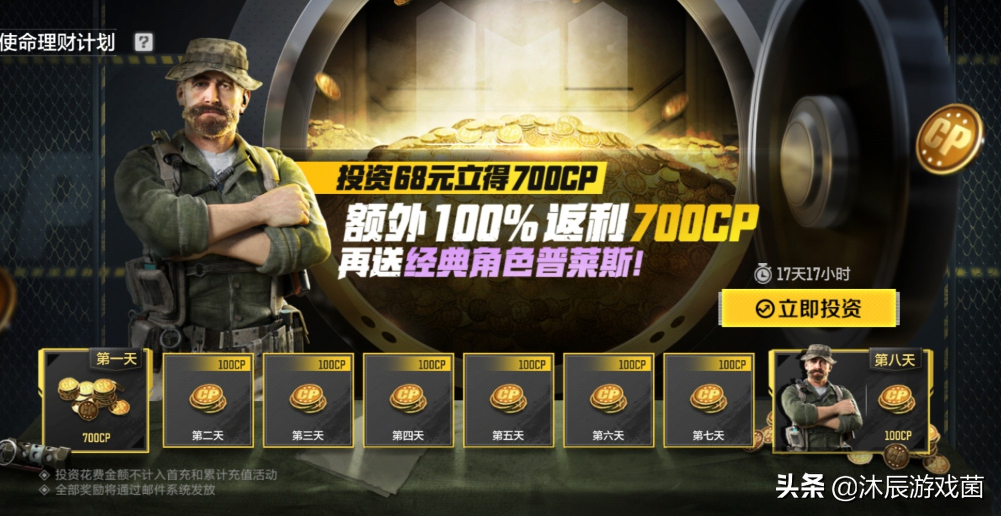 投资类活动,花费68.8元除了能够立刻获得700GP,还可以在接下来的七天内每天获得100GP,总计能够得到1400GP,最后一天还可以获得普莱斯角色。