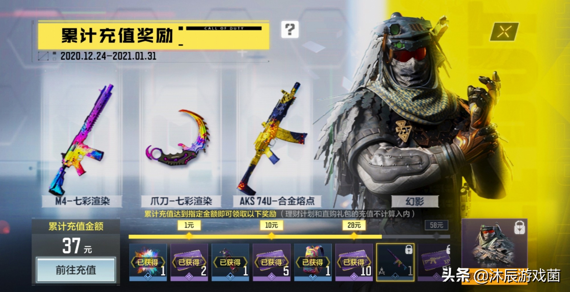不过对于一般的氪金玩家只需要氪588就足够了,因为目前游戏内一个非常热门的累计充值活动,有1、10、28、58、98、188、368、588等不同档位,其中188档位可以得到游戏内非常火热的爪刀皮肤,588档位可以得到人物幻影,如果只是小氪,那么一个38.8个使命手册也足矣。