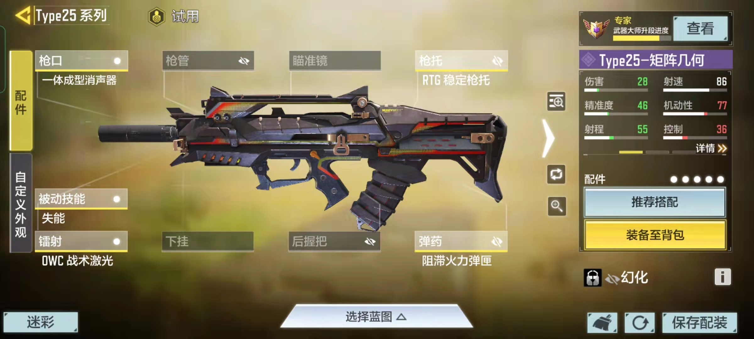 主要配件type25添加一体消音器,RTG稳定枪托、失能 、阻滞火力弹匣、DWC战术激光。