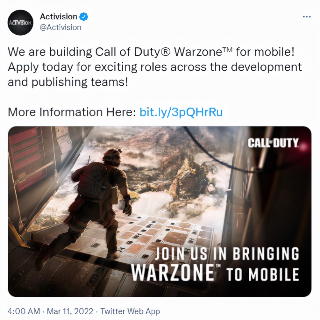 此前有爆料称《使命召唤:战区》手游开发中,并将于今年发售。因为《使命召唤:战区》和《使命召唤:手游》曾取得巨大成功,那么动视开发《使命召唤:战区》手游可能性是很高的。近日动视又发布了招聘广告再次证实了正在开发3A级体验的手机游戏的消息。随后,动视官方在推特上正式宣布了《使命召唤:战区》将推出手游。