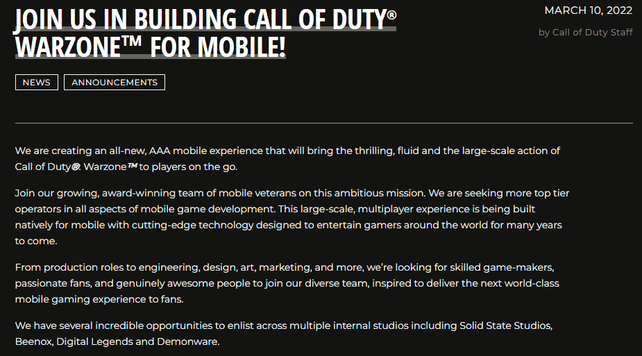 据外媒报道,动视发布的招聘广告中提到,“一款全新的,拥有3A级体验的手机游戏。将把《使命召唤:战区》的惊险、流畅和大规模行动带给玩家。”