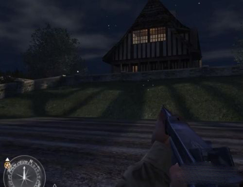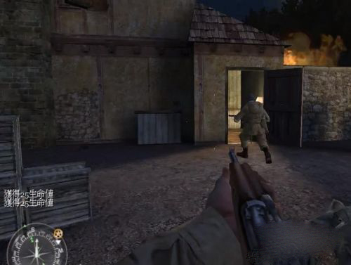 注意!刚进门就会有4名德军,干掉他们。不用上楼,从右边的门出去,向后走,跟着战友。第一关就结束了~