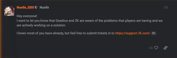 一位Gearbox的社区代表回复称,Gearbox和发行商2K已经了解了相关问题,目前正在积极地寻找解决方案。