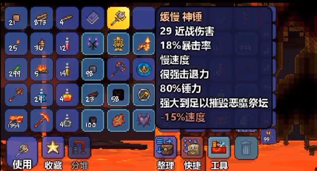 击败肉山之后,肉山必定掉落的物品中有一把神锤,使用神锤可以击碎腐败之地中的腐败祭坛,击败祭坛之后,会获得一些特殊物品,重要的是地图中也会出现一些全新的矿产,玩家可以继续探索全新的地图,也代表玩家正式进入游戏中期。