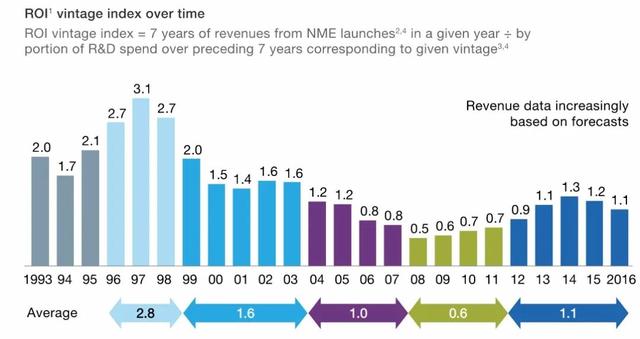 2008年金融危机席卷全球,风暴影响到跨国药企巨头。麦肯锡作了一番统计,研究了过去20年里新药的研发产出比,发现2008-2011那几年是全球医药行业的“低谷期”。