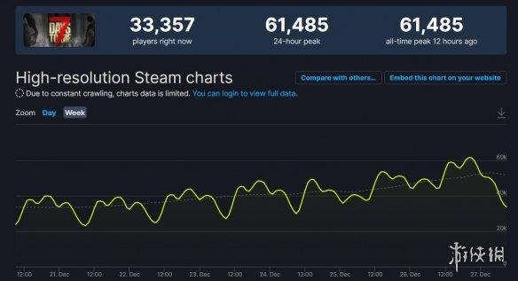 开放世界僵尸生存游戏《七日杀》再次突破了纪录,今日(12月27日)凌晨共有61485名玩家在线游玩,这是该游戏发售8年以来同时在线人数的新纪录。