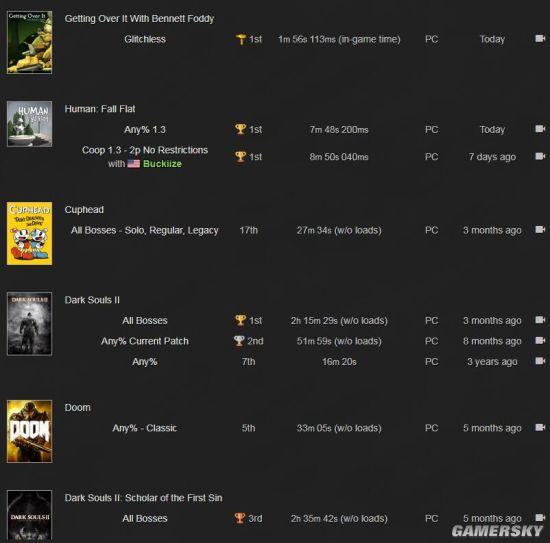 从Speedrun网站的统计来看,这位速通大佬在《黑暗之魂2》、《毁灭战士》、《茶杯头》等游戏的速通中也保持着相当高杆的记录,令人敬佩不已。