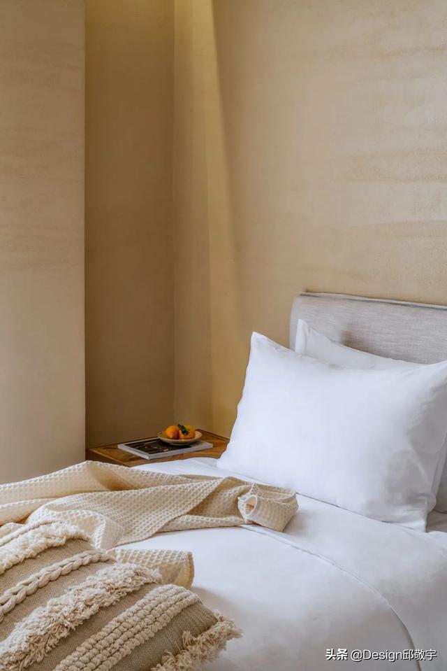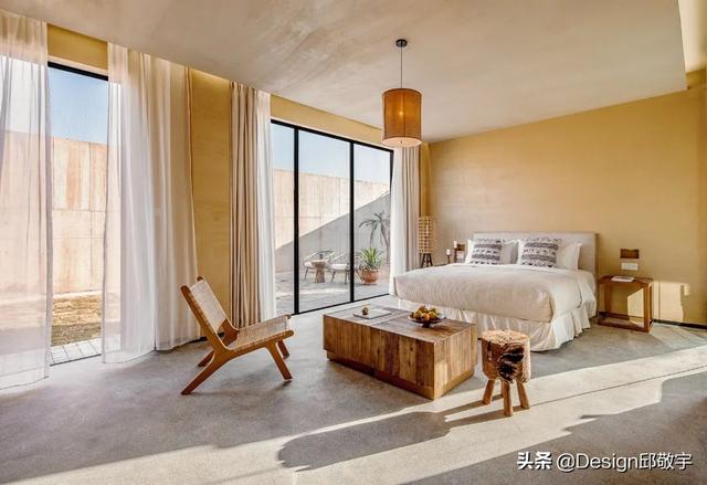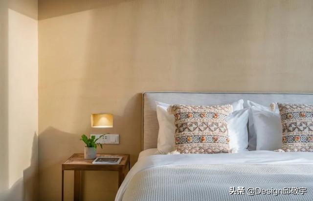 纹理感的原木家具简约大方;白色系的床品质地高级;真皮沙发色泽低调而不失质感。